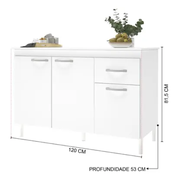 Com 3 portas e 1 gaveta, o balcão proporciona espaço de sobra para guardar utensílios, mantimentos e produtos de limpeza, mantendo tudo sempre à mão. Seu design moderno e funcional combina facilmente com diferentes estilos de cozinha, deixando o ambiente mais organizado e agradável.