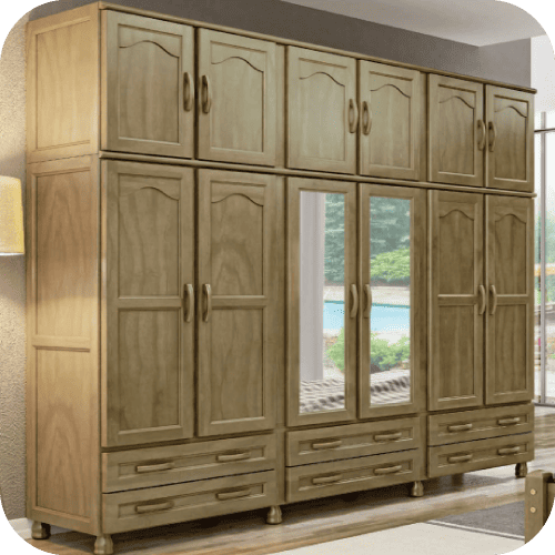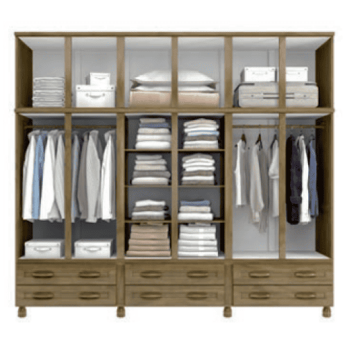 O Roupeiro 6 Portas com 6 Gavetas Externas e Espelho, acabamento Nogueira Fosco, alia design refinado e excelente funcionalidade. Com amplo espaço interno, cabideiros, prateleiras e gavetas externas, é ideal para organizar roupas e acessórios com estilo.