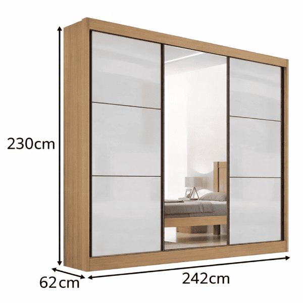 Com 3 portas de correr, ele otimiza o ambiente e facilita o acesso às roupas no dia a dia. Internamente, conta com 6 gavetas com corrediças telescópicas, que garantem abertura suave e maior durabilidade, além de cabideiro em alumínio, resistente e seguro para suas peças.